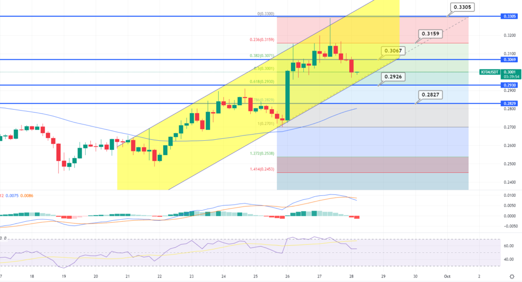IOTA is trading slightly bearish on the technical front, with a target of $0.300 for the 50% Fibonacci retracement. A break below this level will likely prolong the selling trend until the $0.2926 or $0.2827 level. On the 4-hour timeframe, the upward channel is likely to underpin IOTA near the $0.2926 level, so we may see a bullish reversal unless it breaks below this level. On the upside, the main resistance remains near $0.3067 or $0.3159.