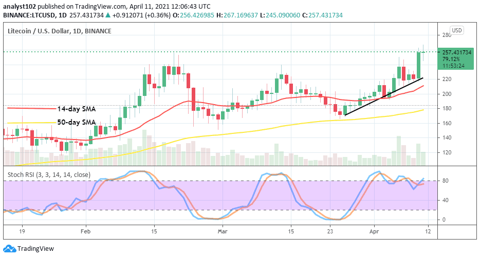 A big bullish candlestick has emerged on the LTC/USD daily trading chart to possibly signal the long-awaited northward-moving continuation. The 14-day SMA trend-line is a bit curved to the north to signify an upward move in motion under the bullish trend-line. The Stochastic Oscillators are moving in a consolidation around range 80. But, now, they are of more crossing the hairs to point to the north. It indicates that more buying pressures will continually be experienced in this crypto-trading activity.