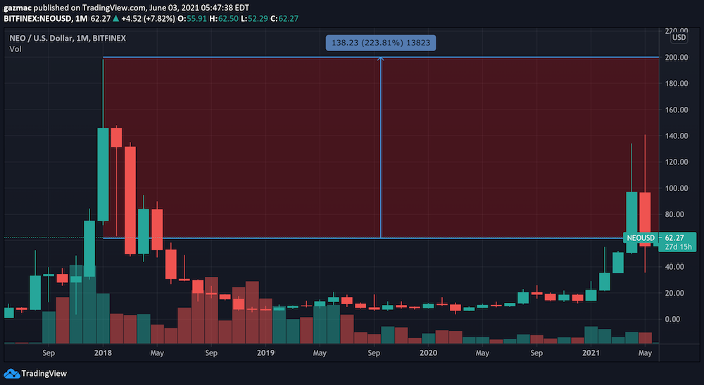For NEO to reclaim its ATH it will have to rise by $138, which would represent a 223% gain on the current price (see the 1-month chart above).