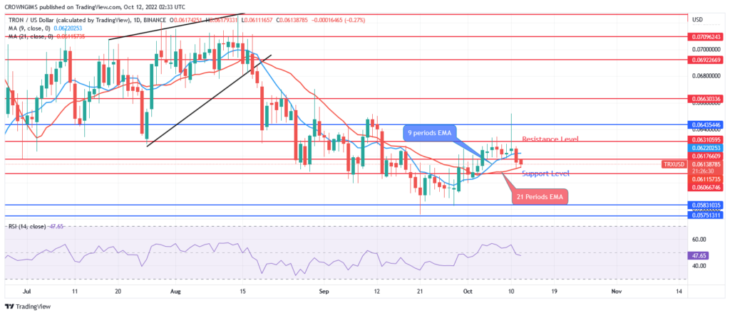 There is probability that the price might go down within the next several trading days as an inverted pin bar candle pattern formed on the daily chart on October 10. On the daily chart, Tron is below the two EMAs with the relative strength index period 14 is at 46 levels with the signal lines pointing towards the south, which indicate a bearish signal.