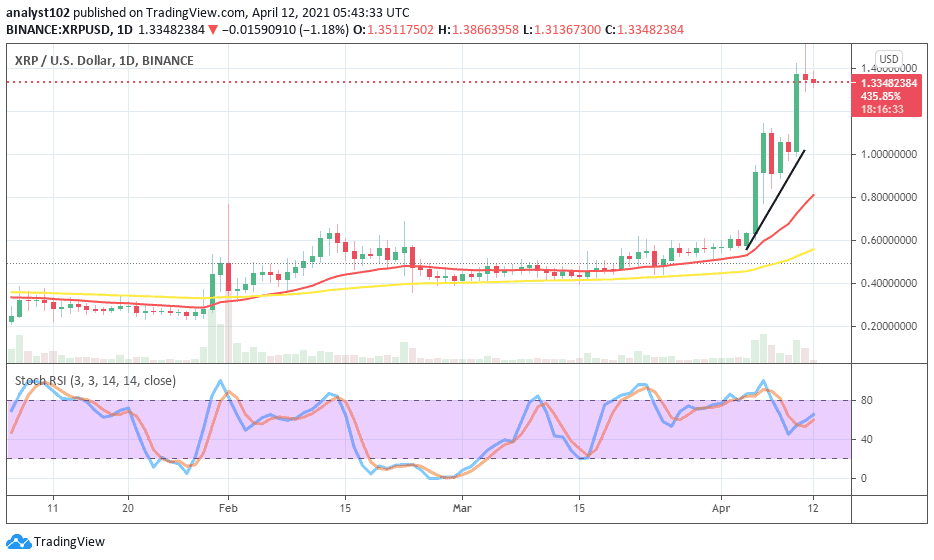 A long-awaited bullish candlestick has finally occurred on the XRP/USD daily trading chart at an upper range line signaling a breakout that puts the market line on a bullish journey now. The 14-day SMA trend-line and the bullish trend-line are below the current price trading spot pointing towards the north to still indicate an ongoing buying pressure around $1.30 level, The 50-day SMA indicator is located close to the recent-past upper range line of $0.60 to also point to the north direction. The Stochastic Oscillators have briefly reversed from the overbought region to now cross the hairs a bit over range 40 to the north. That also signifies that more buying potentials are still in the offing.