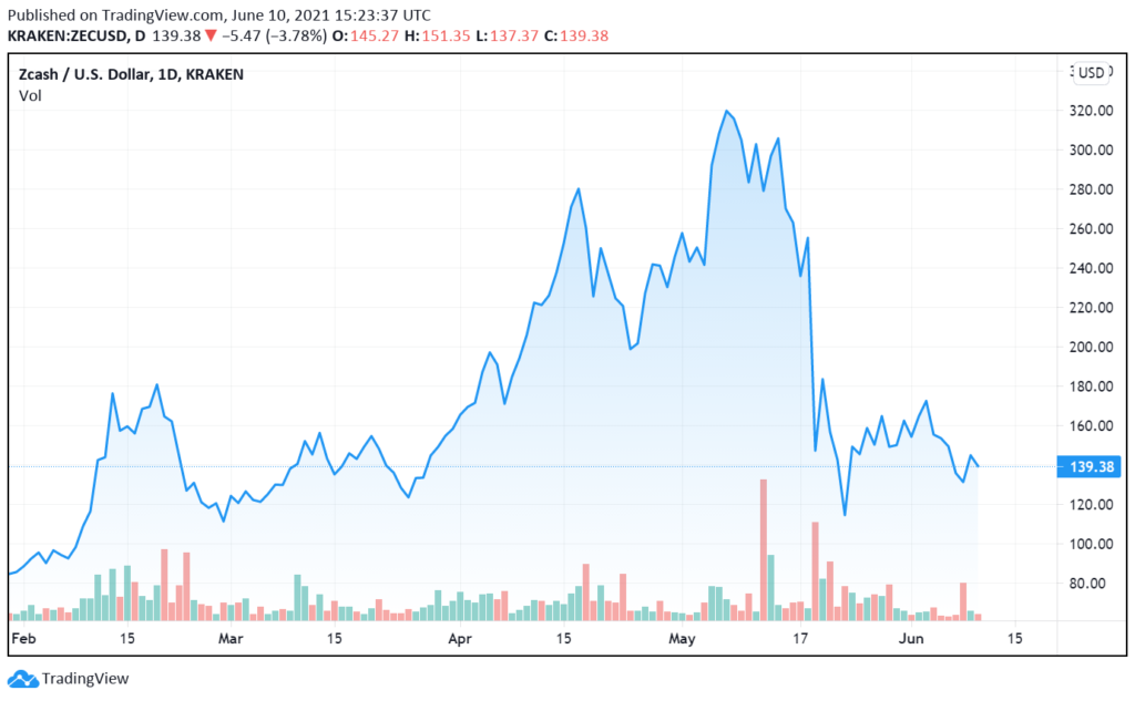 Tracing the history of ZEC price movement, the coin has recorded some highs and lows from the month of May until June 2021. It sold for $319.56 on May 8. But later lost more than 50% on May 20 and went for $146.65.